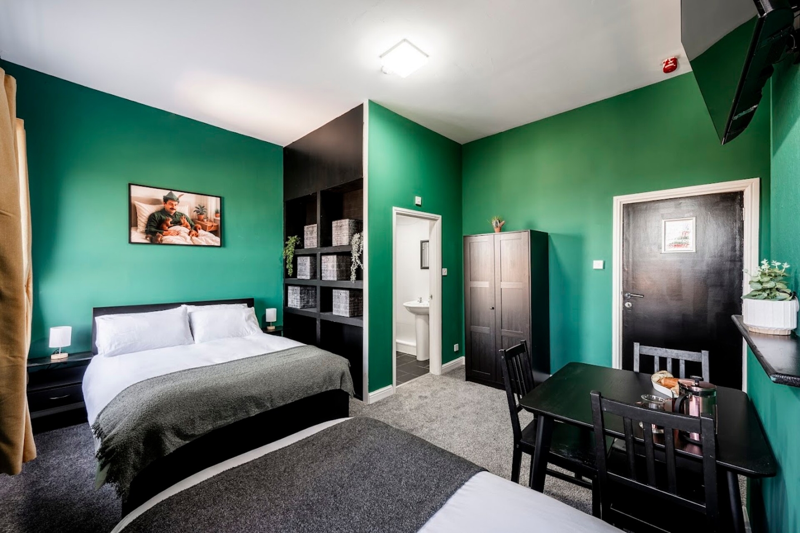 Modern, stylish room with excellent transport links into the city centre. Hop on a nearby bus or tram for a quick and easy trip into the city centre. The space includes a flat-screen TV, free Wi-Fi, and comfortable sleeping arrangements with one double bed and one single bed. Whether you’re enjoying a cosy night in or heading out to explore, this room is the perfect base for your stay.